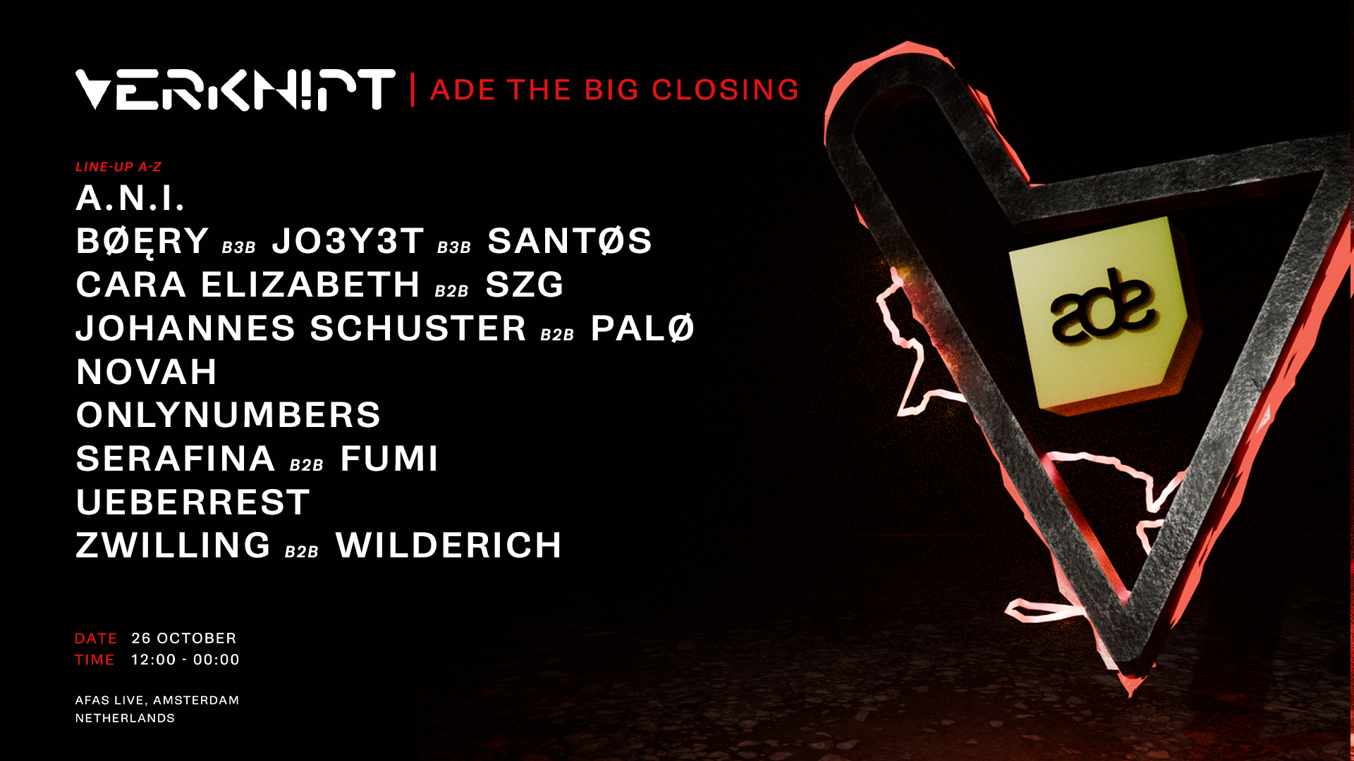 El sábado, Verknipt vuelve para la gran clausura, poniendo fin al ADE por todo lo alto. Con A.N.I., BØĘRY B3B Jo3y3t B3B SANTØS, Cara Elizabeth B2B SZG, Johannes Schuster B2B Palø, NOVAH, Onlynumbers, SERAFINA B2B FUMI, EUBERREST y Zwilling B2B WILDERÍCH, será una noche repleta de energía pura y BPM implacables, la única forma adecuada de cerrar la semana.