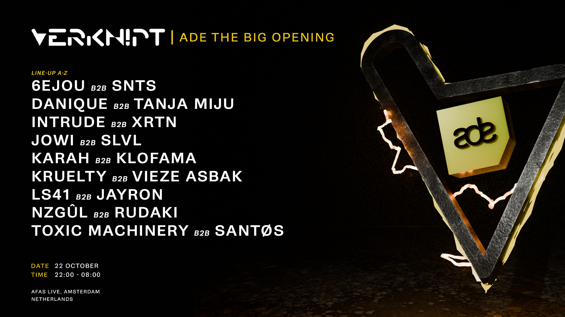 Verknipt da inicio al ADE con una noche de inauguración a todo volumen, transformando AFAS Live en un oscuro y vibrante escenario de sonido. En el cartel: 6EJOU B2B SNTS, DANIQUE B2B TANJA MIJU, INTRUDE B2B XRTN, Jowi B2B SLVL, KARAH B2B KLOFAMA, KRUELTY B2B VIEZE ASBAK, LS41 B2B Jayron, NZGÛL B2B RUDAKI, TOXIC MACHINERY B2B SANTØS. Es el comienzo perfecto para la semana para los amantes del hard techno que quieren sumergirse de lleno.