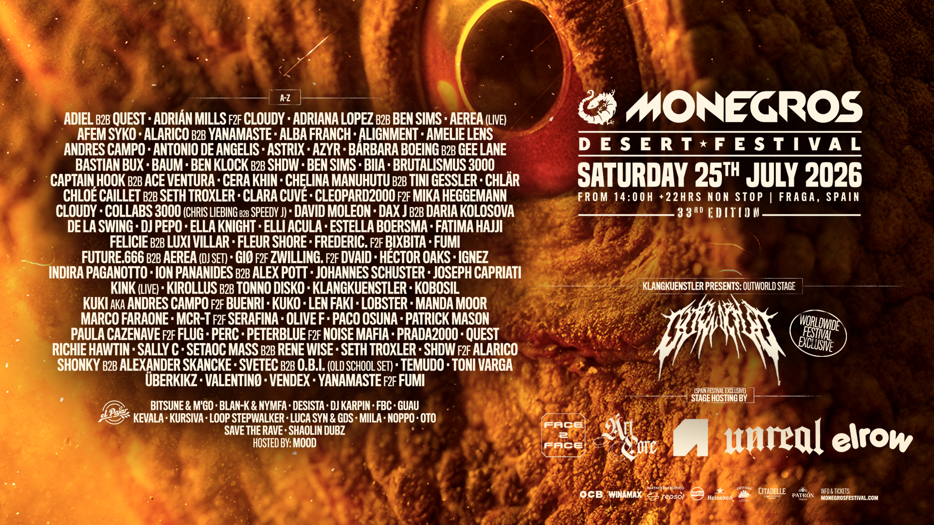 Klangkuenstler y su marca Outworld serán, sin duda, la gran atracción de la jornada y posiblemente del festival. Sabemos que el alemán y su marca son una tendencia constante, y su llegada a Monegros la hace aún más atractiva, con un line-up y un stage a la altura de muy pocos. Tal y como se puede entrever en los artistas que lo compondrán, es un roster hecho a medida por el propio Klang, lleno de grandes B2B que completan una gran sinergia, representado por artistas que encajan muy bien con su sonido.