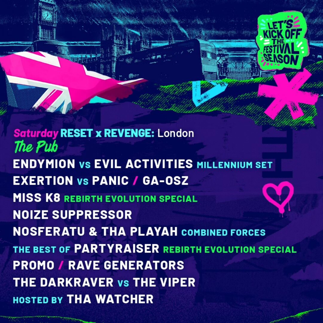 Tras varias ediciones donde el uptempo ha dominado los altos BPMs en la escena, también en este festival, REBiRTH Festival ha decidido apostar por un nuevo escenario de early y millenium hardcore el sábado: RESET x REVENGE. En él encontraremos nombres como un especial Endymion vs Evil Activities, Exertion vs Panic, The Darkraver vs The Viper, Promo o Rave Generators, entre otros.