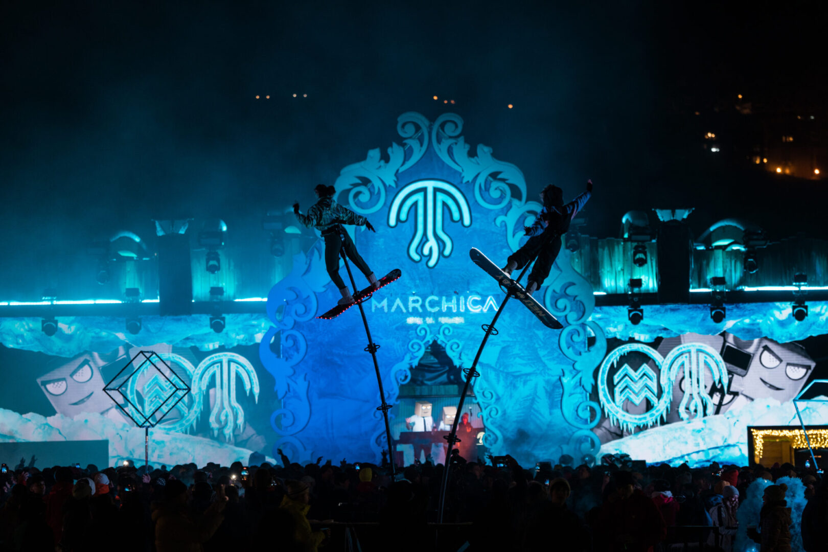 La intro audiovisual, de diez minutos de duración, dejó boquiabiertos a los asistentes de Medusa Winter Takeover. Las 200 mininaves, perfectamente sincronizadas y controladas desde tierra, formaron los logotipos de Medusa y Marchica con LEDs de colores, combinados con voz, música, fuegos artificiales, llamaradas de fuego y otros efectos especiales. Un momento mágico que recordó a las grandes postales que el festival valenciano ofrece cada verano en Cullera, esta vez con el Pirineo como telón de fondo.