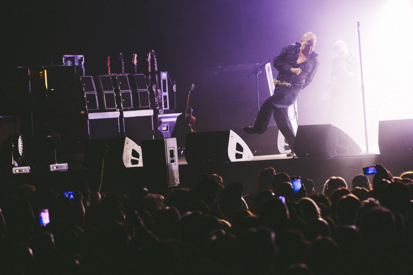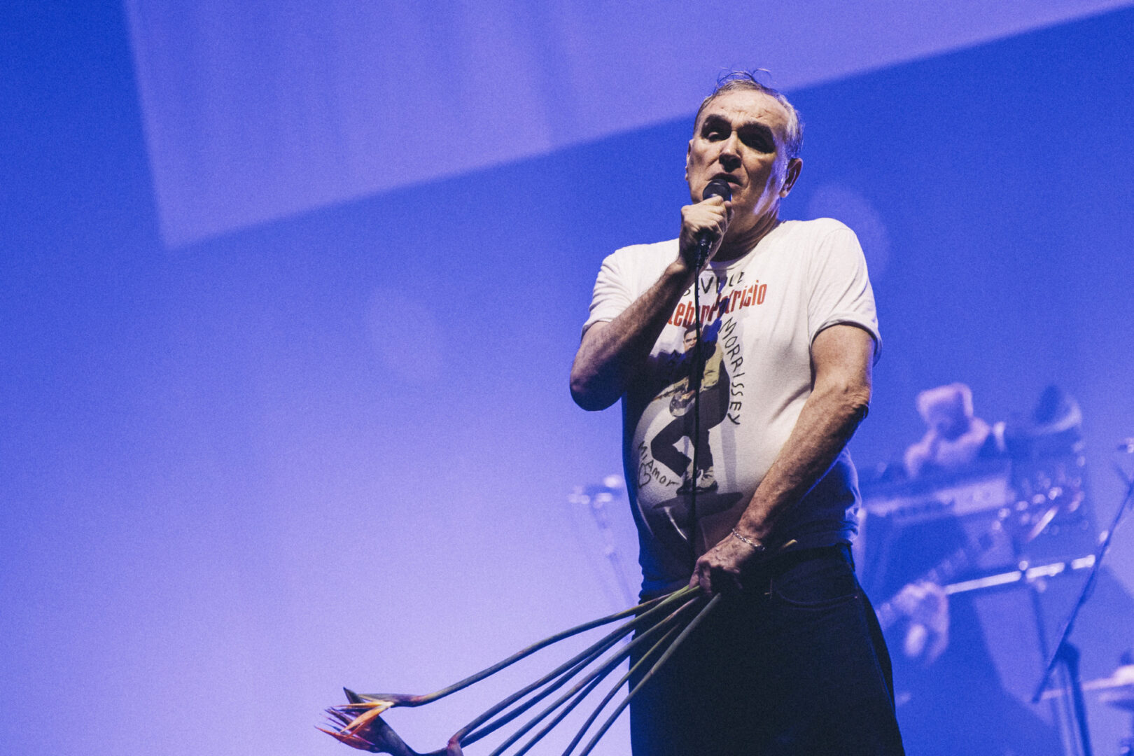 Eso sí, cuando las luces se apagaron y llegó el momento, ya toda la atención recayó en Morrissey. Algo que no es difícil que ocurra. Entró con la misma esencia de siempre: descamisado, con sus icónicas flores al cinturón y las cuales algunos afortunados de primera fila pudieron llevarse a casa, portando unas maracas y sus primeras palabras fueron repetir tres veces «lo siento», a cada cual más exagerada, antes de arrancar con uno de sus clásicos, ‘Billy Budd’. El de Manchester fue pura actitud de estrella del escenario, jugueteando con su micro con cable (como en los viejos tiempos, nada de inalámbrico) y poniendo al público a corear canciones como ‘Suedehead’ o ‘First of the Gang to Die’.