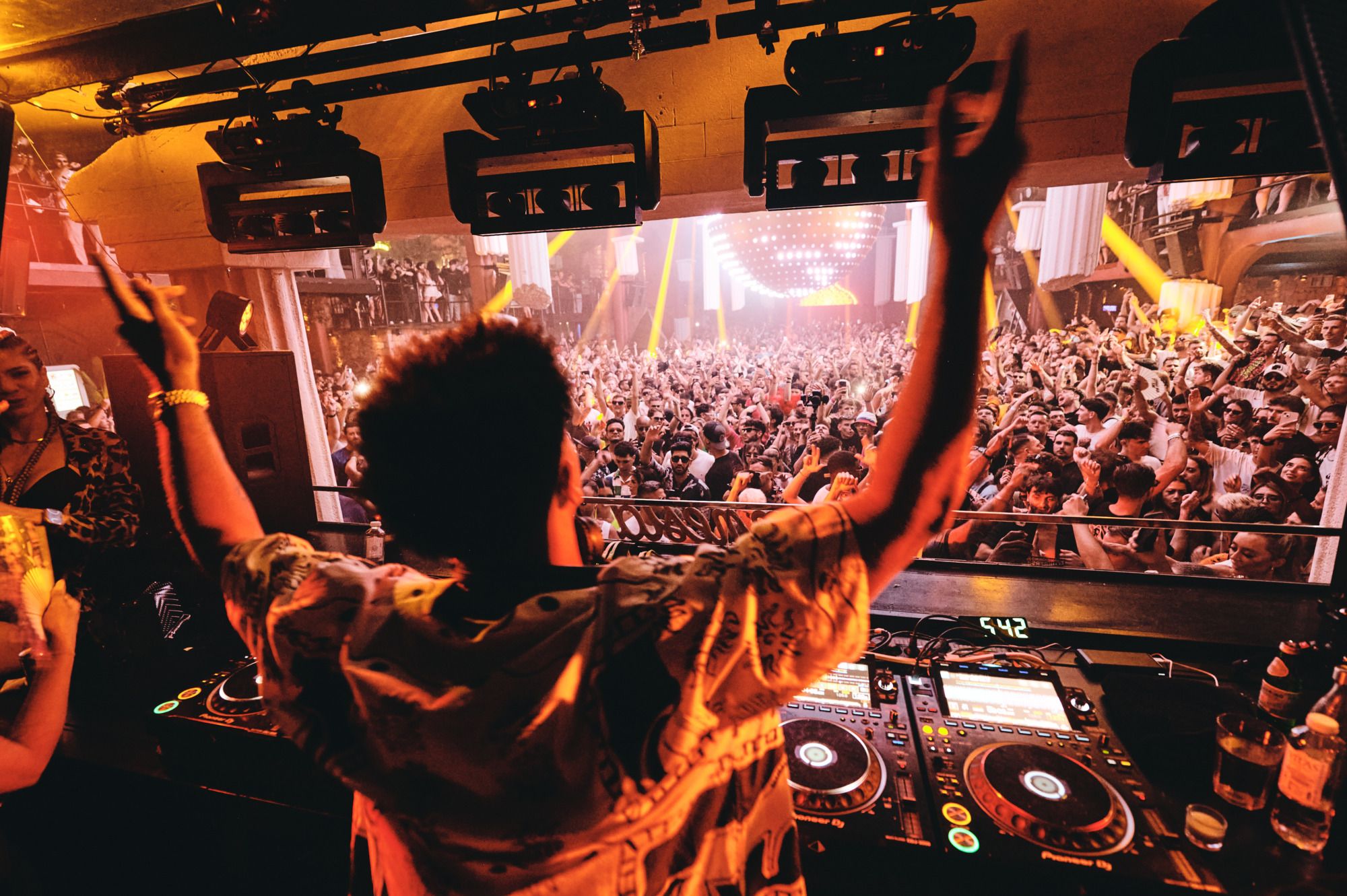 La icónica Terrace se vestía de gala para una noche especial. La decoración de la cabina, que simula la fachada de un panteón, varios pilares dóricos colgados del techo, una gran bola de discoteca repleta de parpadeantes luces de colores, tiras led a lo largo de todo el techo y el repertorio habitual de lásers y focos de la sala, en compañía del potente y nítido sonido envolvente fueron los aspectos más representativos de Temples of the Sun, la nueva temática elegida por Jamie Jones. A pesar de los múltiples detalles decorativos, la música, como de costumbre, fue la protagonista, con Pirate Copy, Manda Moor y Richy Ahmed exhibiendo sus temas favoritos de house y minimal en una progresión horaria muy consecuente como primeros artistas de una sala que al poco de abrir sus puertas ya estaba prácticamente llena hasta la bandera.