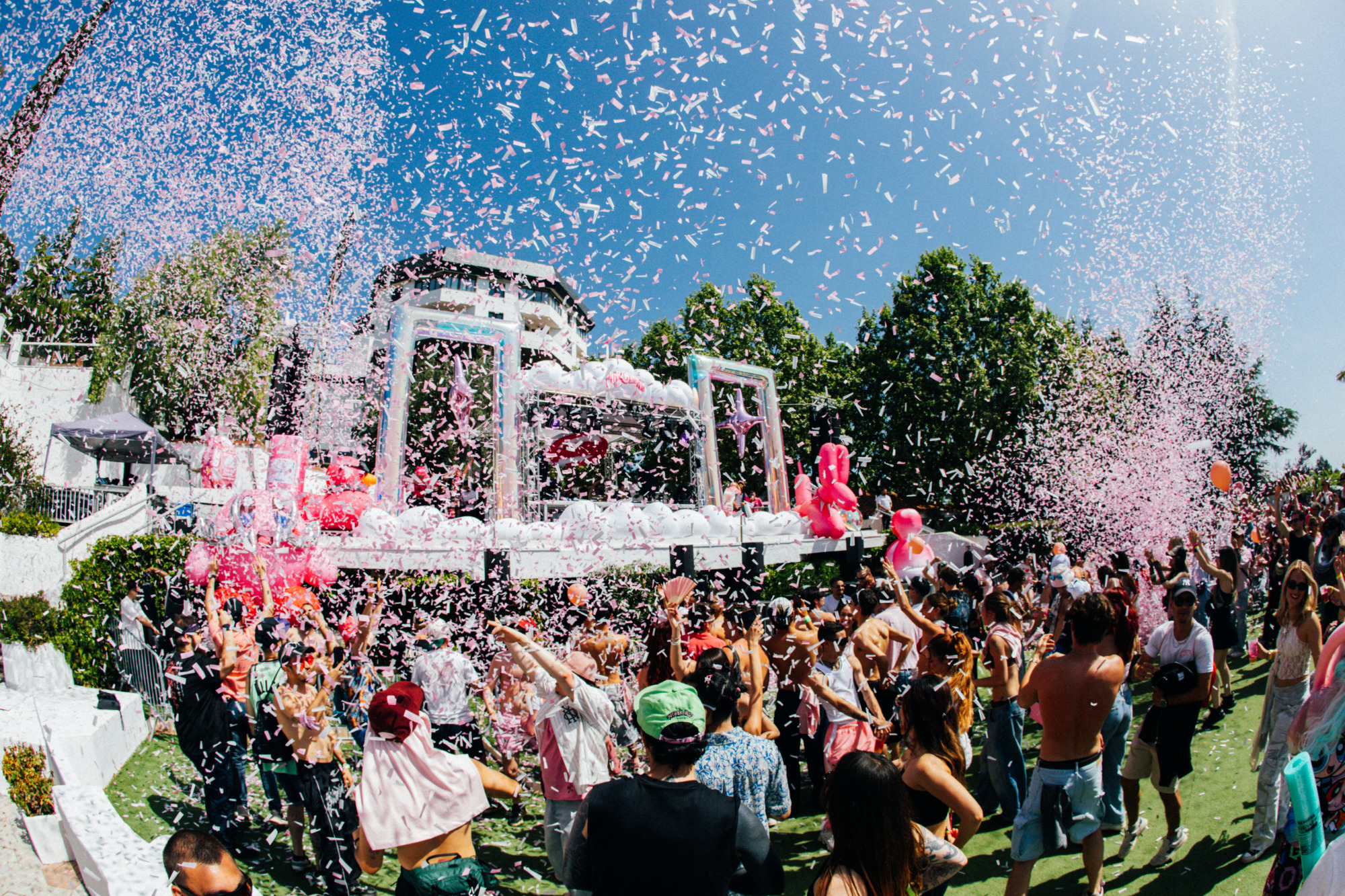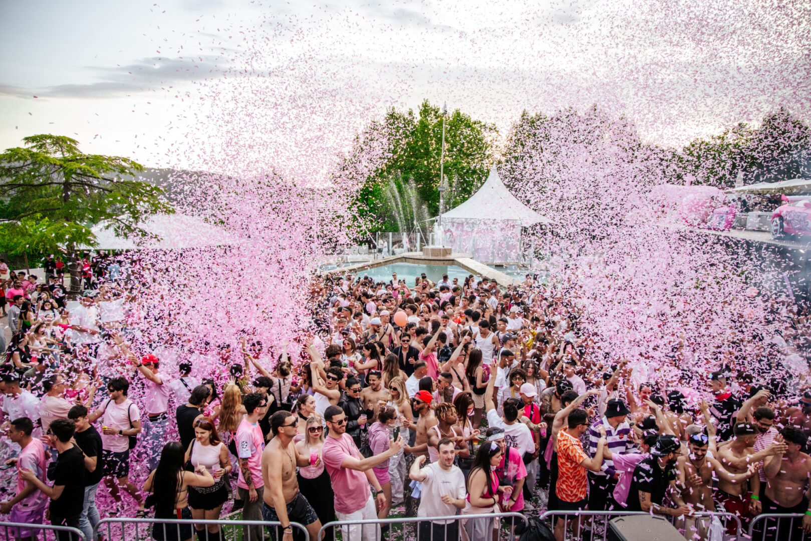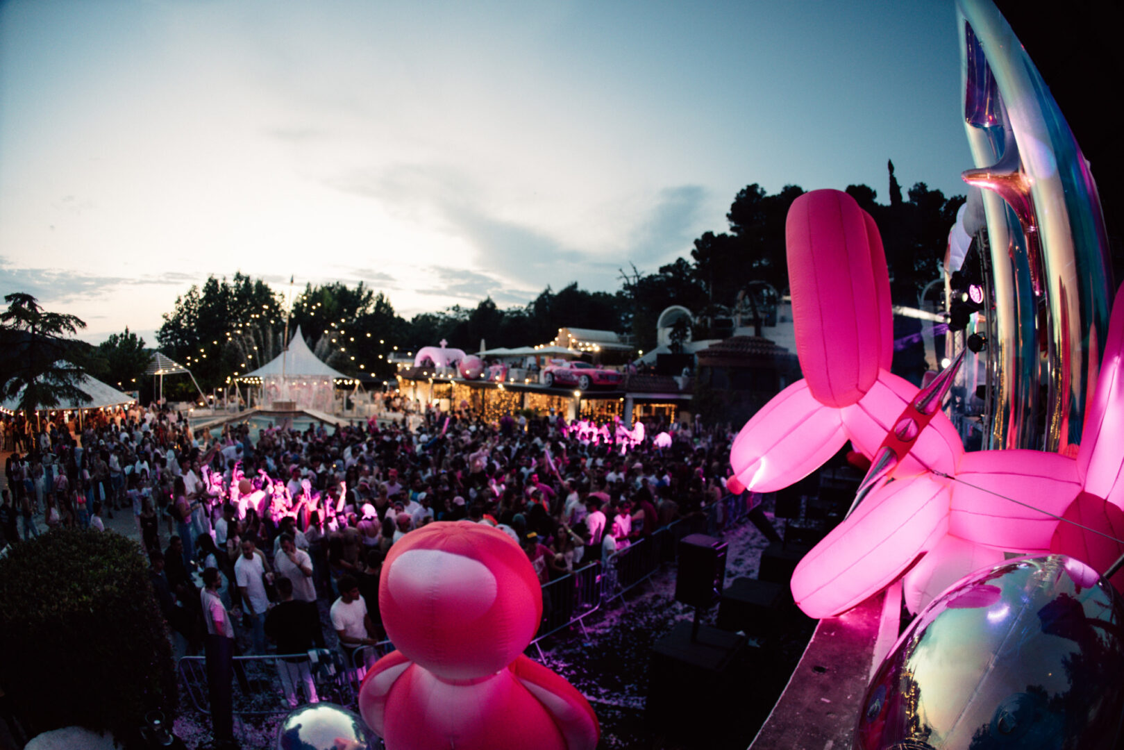 La decoración fue más que acertada. Entrar al recinto era como meterse en un universo Barbie. El protagonista absoluto fue el característico color rosa, que invadía cada rincón del espacio. Todo tenía ese punto de fantasía con estética dosmilera. El escenario, en el centro, estaba decorado con nubes y con el inconfundible logo de Pinkcloud, acompañado de la temática de la fiesta Pink2k. A los lados, dos tarimas donde siempre había gente dándolo todo. Hinchables gigantes, una iglesia, un perro tipo globo de feria e incluso un coche… todo, cómo no, en rosa. También contaban con un amplio backstage y una terraza exclusiva, la Pink Lounge. Y como detalle, su propia bebida energética personalizada para la ocasión.