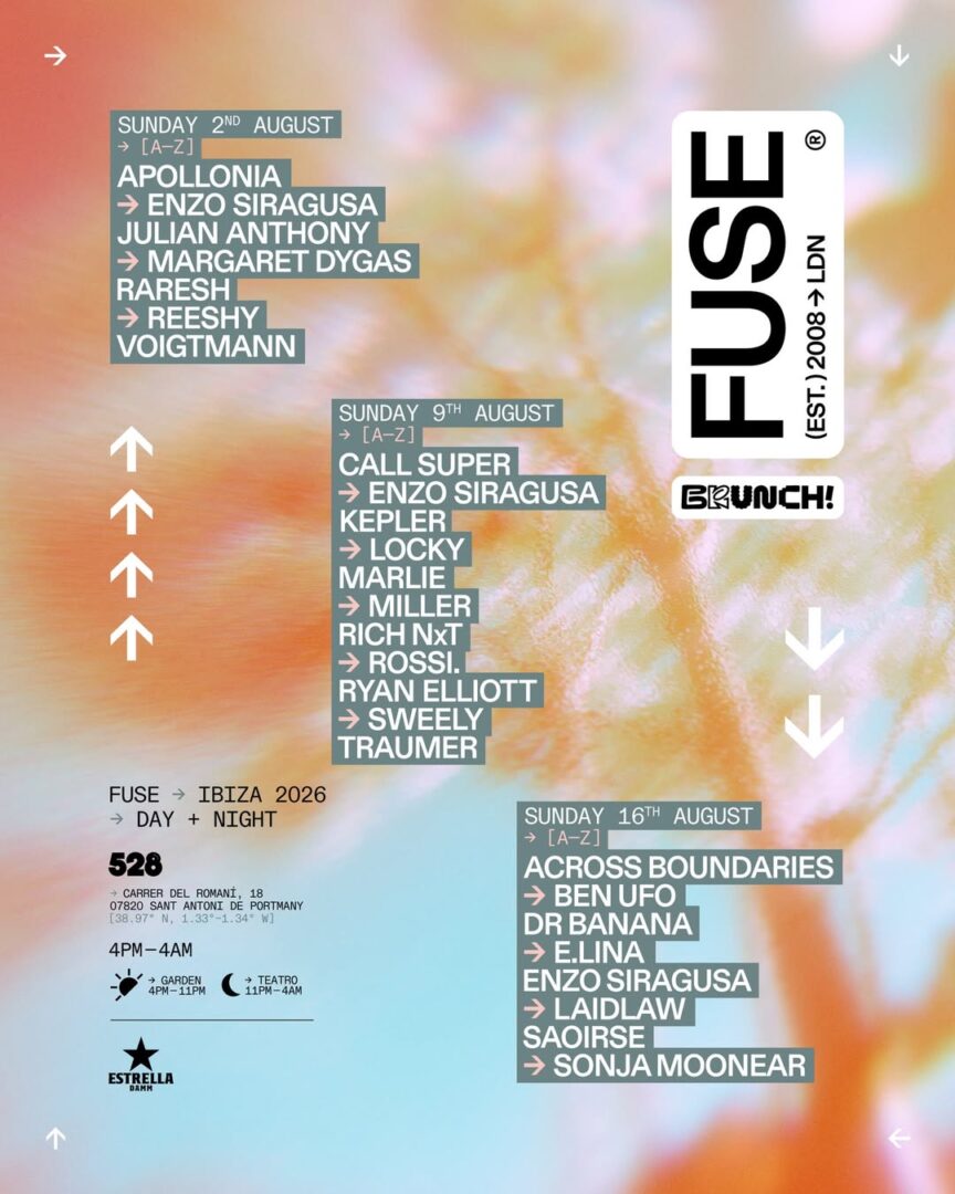 Los domingos vuelven a ser de Brunch Electronik, y de momento tenemos 3 citas de FUSE London para los días 2, 9 y 16 de agosto con la presencia de artistas como Enzo Siragusa, Raresh, Rossi. o Across Boundaries. La marca anunciará próximamente nuevos acontecimientos.