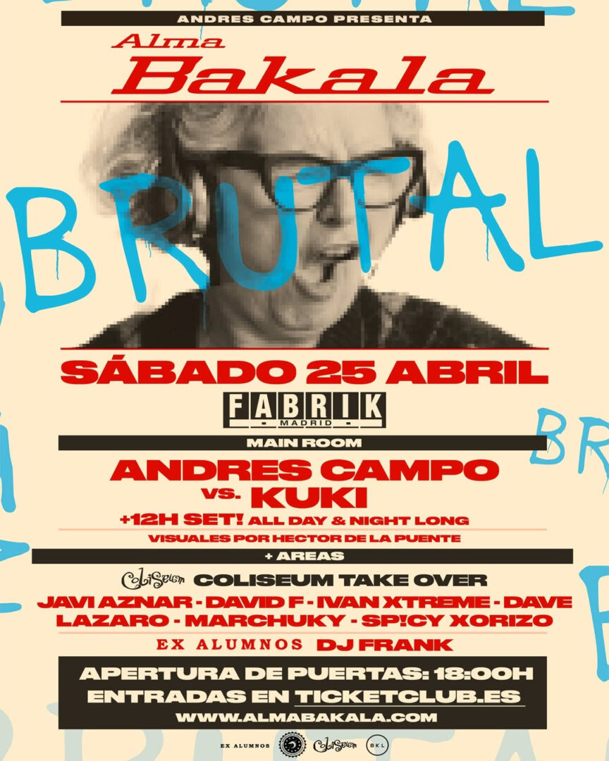 El 25 de abril no será una fecha más en Fabrik. Andrés Campo plantea uno de los movimientos más poco habituales que se pueden ver hoy en día en la escena club: una sesión maratoniana de 12 horas seguidas -de 18:00 a 06:00- presentando Alma Bakala, su exitosa apuesta que revive el espíritu de la Ruta del Bakalao.