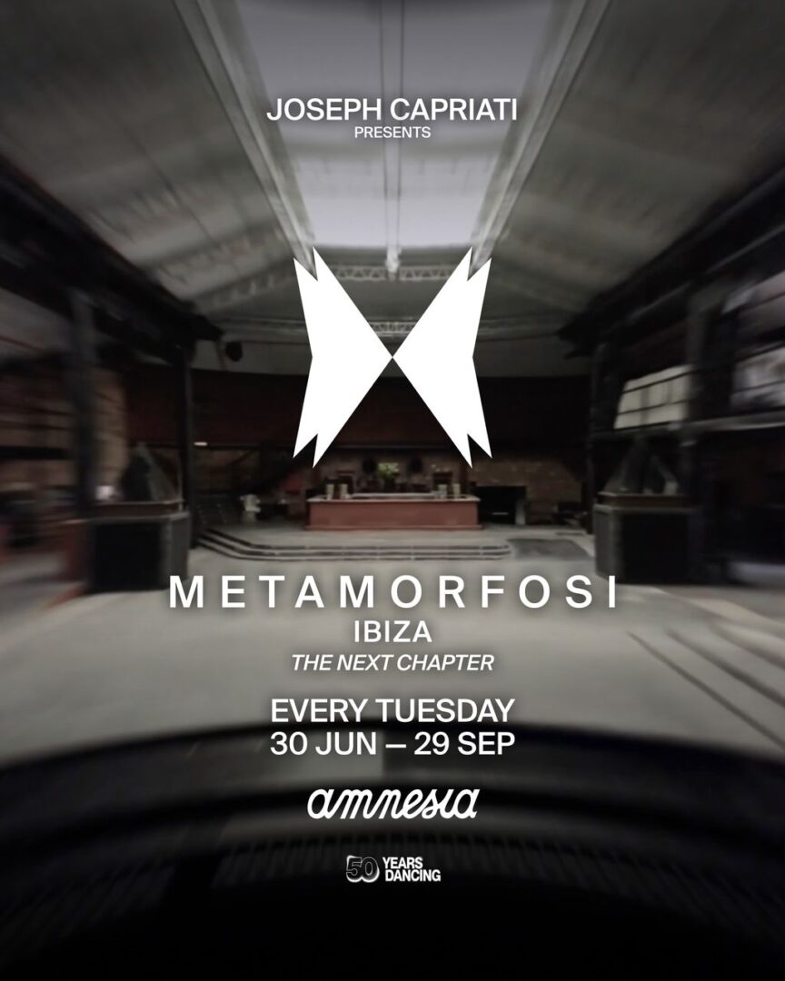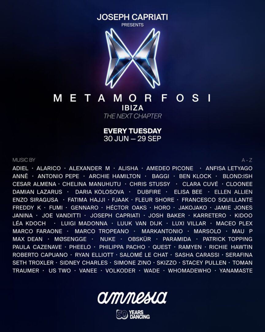 Joseph Capriati vuelve a su casa —de la que nunca debió irse— con Metamorfosi, que invadirá ambas salas con una identidad sonora heterogénea y un concepto cimentado que simboliza el cambio y el crecimiento continuo con la mariposa como emblema. La fiesta nace en 2022 en Amnesia Ibiza como una invitación a abrazar la evolución personal y musical del artista y basa sus raíces en el flujo de la energía y la conexión humana en la pista de baile. Toda esta narrativa musical se pondrá de manifiesto del 30 de junio al 29 de septiembre, con 14 martes que convierten a la residencia de este año en la más larga del italiano en el club.