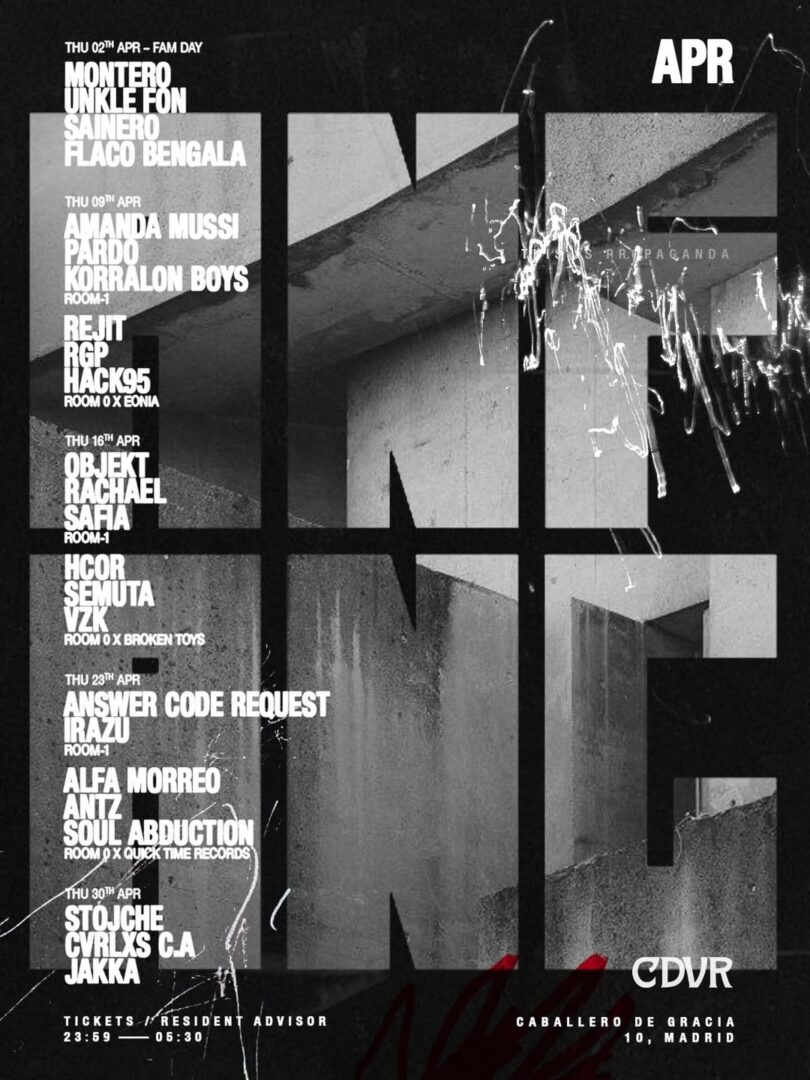 El formato se divide en dos espacios que funcionan de forma complementaria. ROOM 0 pone foco en el tejido local, dando cabida a colectivos y proyectos emergentes como Broken Toys, Eonia o Quick Time Records. En paralelo, ROOM -1 se plantea como un entorno más inmersivo: sonido D&B, estética industrial y una programación internacional que este mes incluye nombres como Montero, Amanda Mussi, Objekt, Answer Code Request y Stojche.