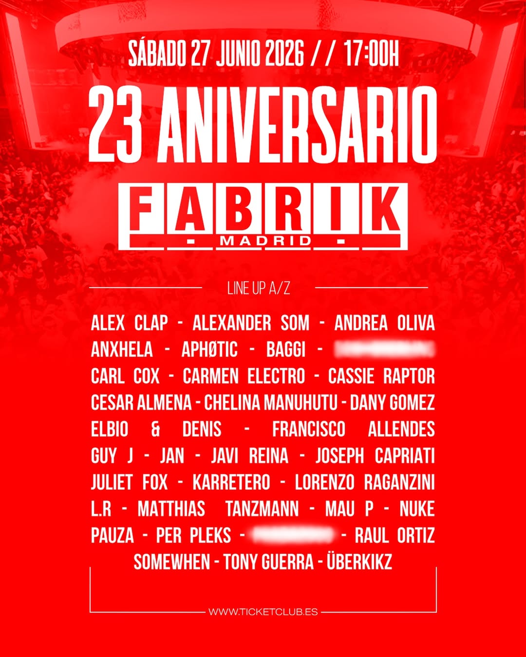 En este artículo ampliamos la información que ya adelantamos el pasado mes de diciembre, cuando FABRIK confirmó a Carl Cox como primer headliner del evento. Entonces ya se intuía la dimensión de la cita, con un formato extendido de 17:00 a 06:00 y múltiples áreas abiertas. Ahora, con el line-up completo sobre la mesa, queda claro que el 23º aniversario no solo celebra la trayectoria del club, sino que reafirma su posición como uno de los espacios más influyentes de la escena electrónica europea.