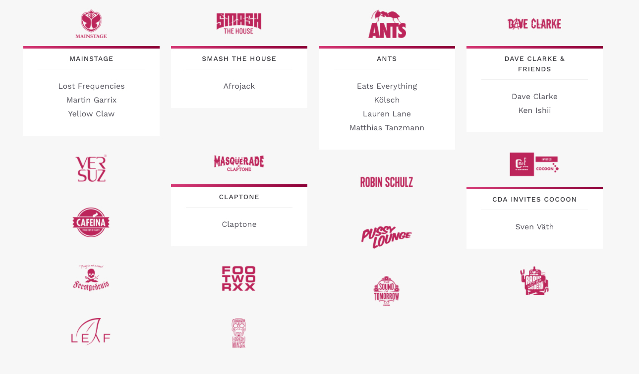 Como novedades más importantes destacamos la aparición de Ants, que estará los dos findes, y Masquerade, el stage de Claptone.
