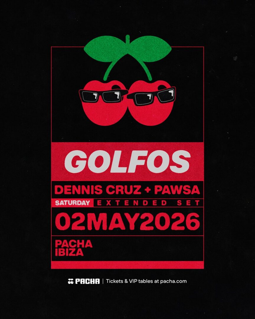El binomio formado por Dennis Cruz y PAWSA hace su debut en la sala el 2 de mayo con un extended set que promete convertirse en uno de los eventos del verano debido al gran momento de ambos artistas y a lo exclusivo de su aparición conjunta en la isla. GOLFOS busca transmitir una actitud fiestera y desenfadada y combina los estilos de sus protagonistas para crear sesiones hipnóticas y enérgicas.
