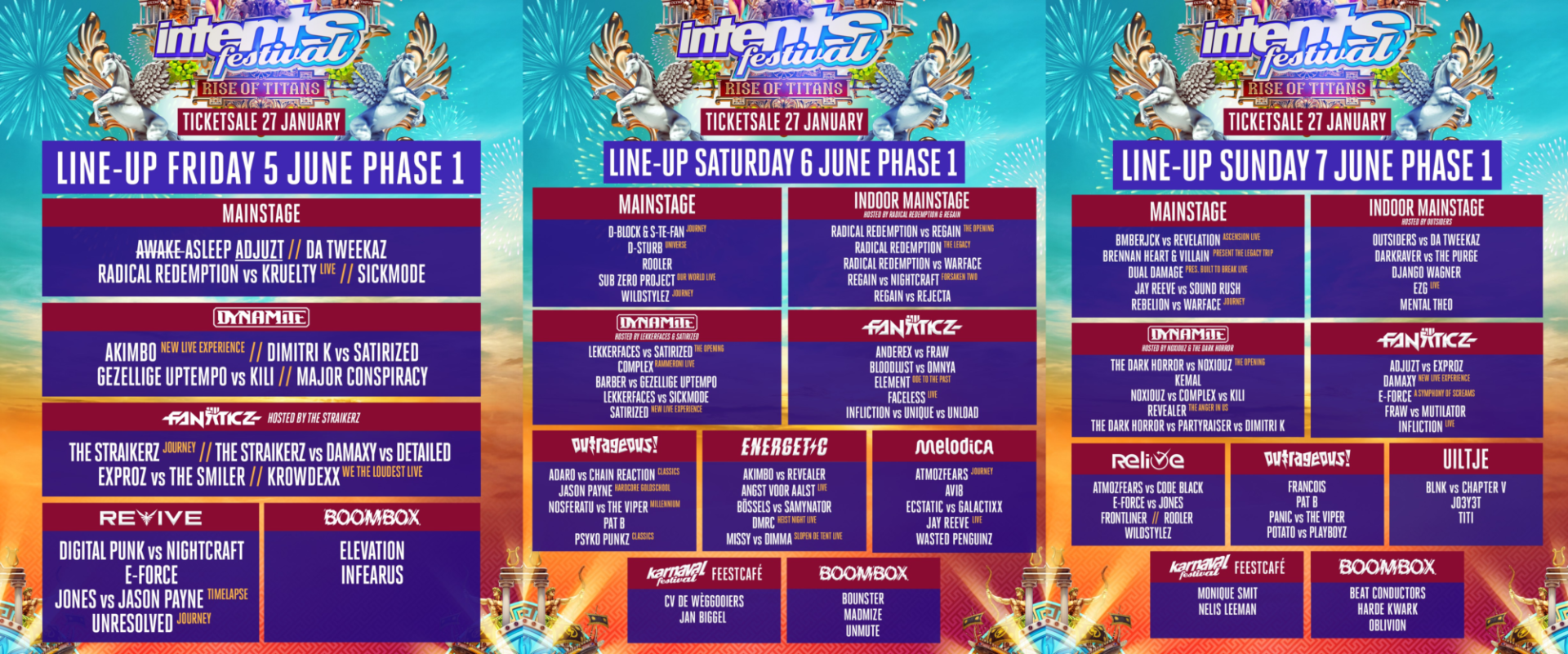 El cartel, aunque está lejos de estar completo, ya desvela muchas cosas interesantes. El viernes podremos disfrutar del liveact de Adjuzt o de un exclusivo Radical Redemption vs Kruelty LIVE en el mainstage, de Dimitri K vs Satirized o Gezellige Uptempo vs Kili en el Dynamite o de un Journey Set de The Straikerz, así como de un triple back-to-back de los catalanes junto a Damaxy y Detailed en su hosting del Fanaticz.