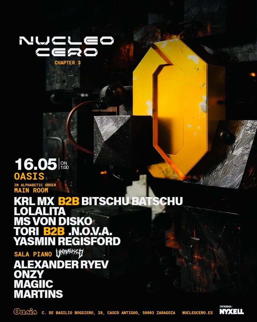 Zaragoza vuelve a mirar de frente a la escena europea con el tercer capítulo de Núcleo Cero, que aterriza el próximo 16 de mayo desde la 01:00 en Sala Oasis. El proyecto, nacido en este mismo espacio con la idea de reunir diferentes corrientes de la electrónica sin etiquetas rígidas, regresa con una nueva cita que se mueve entre hard techno, hard dance, trance, industrial y sonidos de club de alta intensidad.