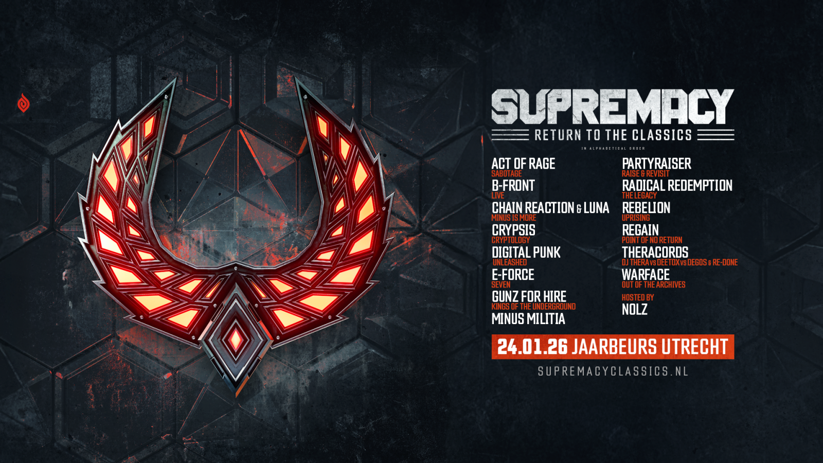 Supremacy – Return to the Classics tendrá lugar el 24 de enero en el Jaarbeurs de Utrecht y contará con los nombres más importantes de la anterior generación de rawstyle, como Crypsis, E-Force, Warface, el regreso de Minus Militia ¡y muchos más!