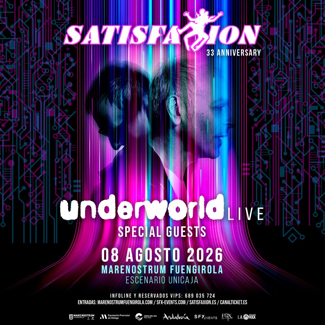 El 8 de agosto de 2026, Marenostrum Fuengirola volverá a ser el epicentro de la música electrónica con la llegada de una de las bandas más influyentes e icónicas de la historia: Underworld. El dúo británico, Underworld llega a Málaga, responsable de algunos de los himnos más emblemáticos del género, encabezará el nuevo evento de Satisfaxion, que promete convertirse en una de las citas imprescindibles del próximo verano.